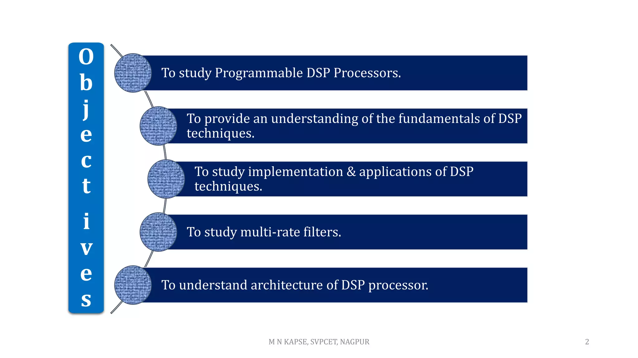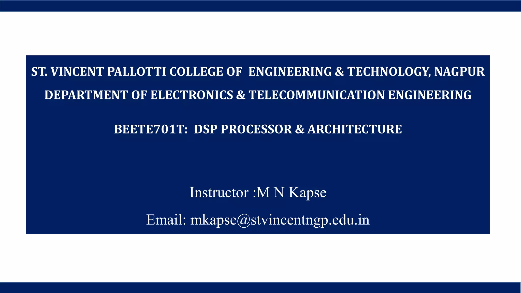 This document outlines the course details for the subject DSP Processor & Architecture taught at St. Vincent Pallotti College of Engineering & Technology in Nagpur, India. The course objectives include studying programmable DSP processors, DSP techniques, and the architecture of DSP processors. By the end of the course, students will be able to describe DSP processor architectures, write DSP programs, design and implement DSP algorithms using development tools, and design filters. The course covers topics such as DSP fundamentals, the TMS320C5X architecture, programming DSPs, advanced processors, and implementing basic DSP algorithms and filters.