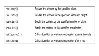 The document provides information on dynamically accessing and manipulating web pages with JavaScript and jQuery. It discusses getting and setting element values, attributes, styles, sizes and positions. It also covers dynamically adding, removing, replacing and rearranging elements. Specific methods for these manipulations using jQuery are demonstrated through code examples, such as using html(), remove(), replaceWith(), after() and toggleClass(). The document also discusses interacting with the window, browser and screen objects.