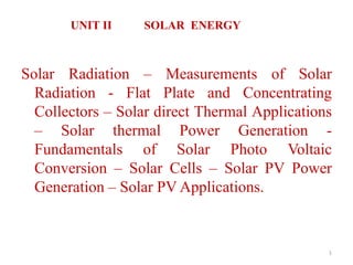 - The document discusses various topics related to solar energy including measurements of solar radiation, solar collectors, solar thermal applications, solar photovoltaic conversion, and solar cells.