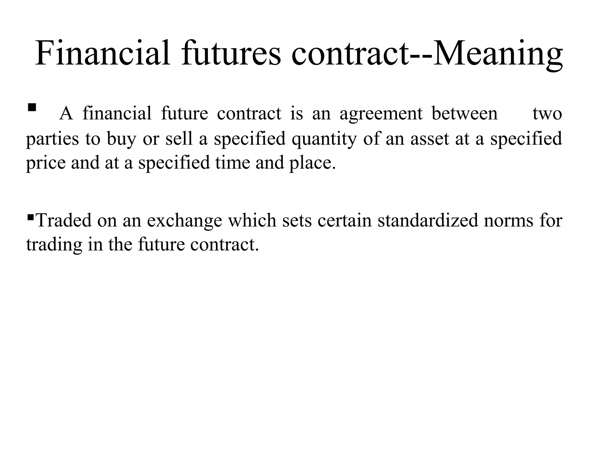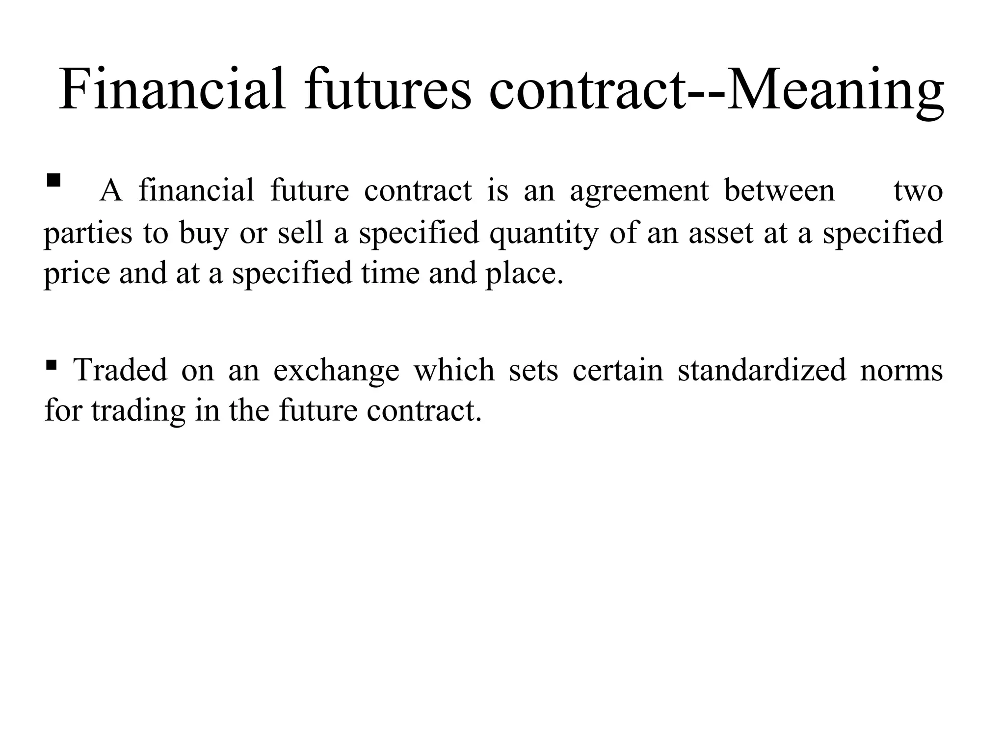A financial futures contract is an agreement to buy or sell a financial asset like a stock, bond, currency, or index at a predetermined price and date. These contracts are standardized and traded on an exchange. There are several types of financial futures including interest rate futures, foreign currency futures, stock index futures, and bond index futures. Participants in the futures market include hedgers who aim to reduce risk, speculators who try to earn profits from price movements, arbitrageurs who seek riskless profits from pricing discrepancies, and spreaders who take positions to lower risk. The key functions of futures markets are hedging risk, price discovery, financing, providing liquidity, and stabilizing prices.