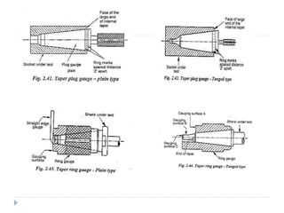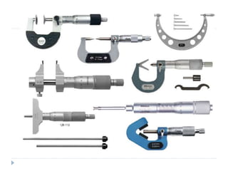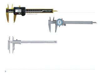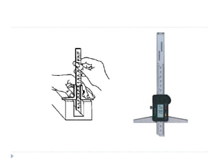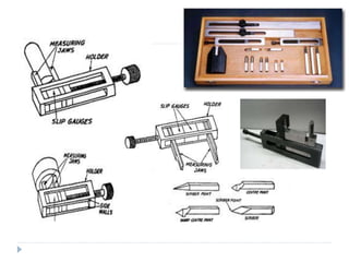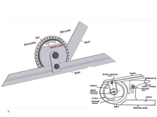 Linear and angular measurements are fundamental concepts in metrology. There are several precision tools used for linear measurements, including rulers, vernier calipers, and micrometers. Vernier calipers use a vernier scale to measure lengths with an accuracy of 0.02mm or better. Micrometers can measure with an accuracy of 0.01mm or better using a screw mechanism. Other important linear measuring tools discussed include slip gauges, height gauges, and depth gauges. Angular measurements are also important and were historically used for navigation.