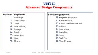 Advanced design components discussed in the document include backdrops, checkboxes, chips, date pickers, dialogs, dividers, image lists, lists, menus, progress indicators, radio buttons, sheets, sliders, snackbars, switches, tabs, tool tips, and time pickers. The document provides specifications, guidelines and examples for each component.