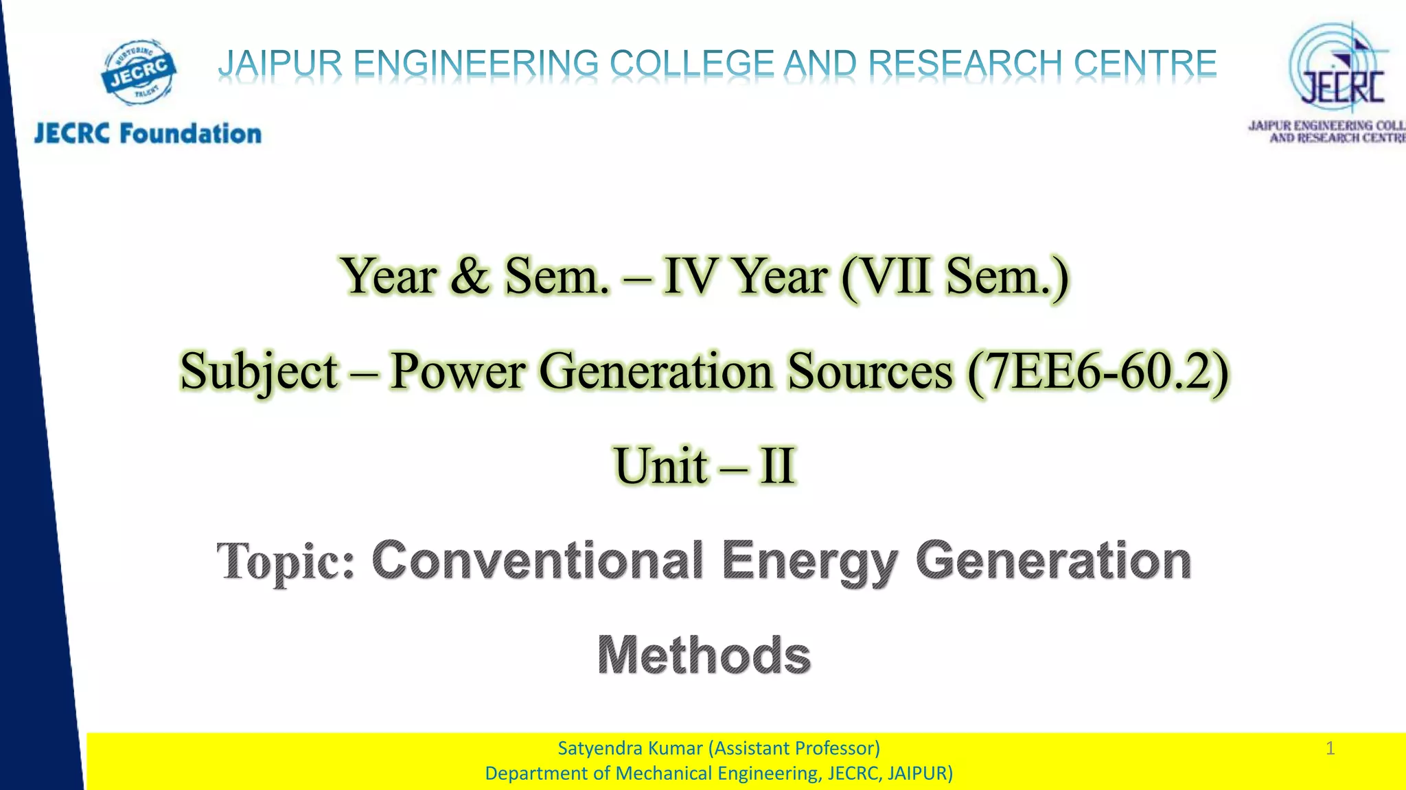 The document discusses various types of power generation sources including thermal power plants, gas turbine power plants, and hydropower plants. It provides details on the working, layout, components, and classification of each type of power plant. For thermal power plants, it describes the basic Rankine cycle process and highlights key equipment like the boiler, turbine, condenser, and feedwater heater. It also discusses the working, advantages, and limitations of gas turbine power plants. Finally, it classifies hydropower plants based on capacity, head, purpose, facility type, and hydrological relation.