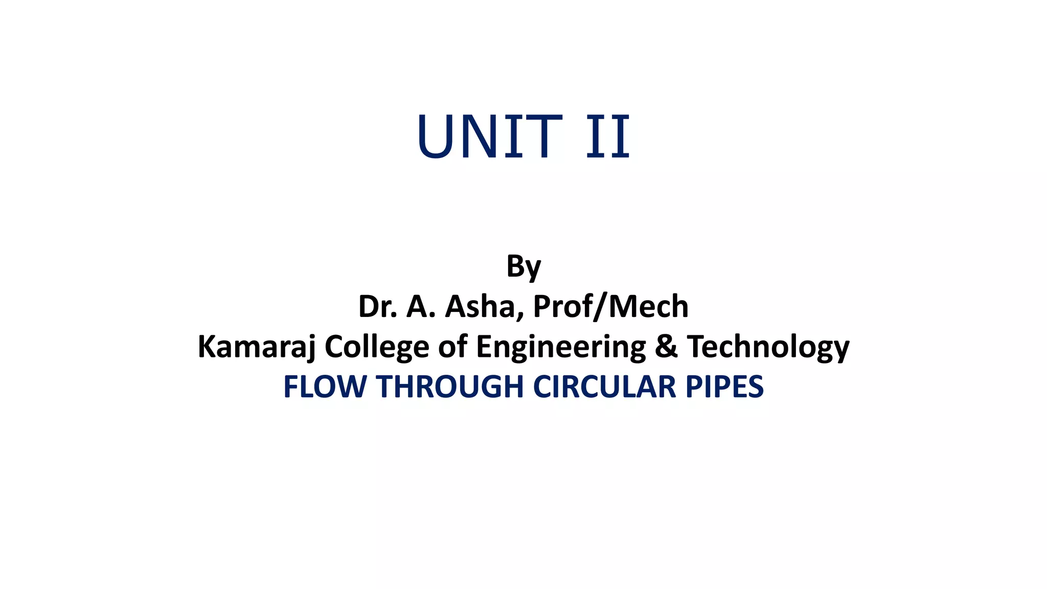 The document discusses flow through circular pipes. It considers a horizontal pipe of radius R with a fluid element of radius r sliding through the viscous fluid. An equation is derived for the velocity profile by equating shear stress and rate of deformation. The equation contains an integration constant C which is determined using the boundary condition that velocity is 0 at the pipe wall (r=R). This allows determining the maximum velocity Umax at the center of the pipe (r=0). The flow rate per second through an elementary ring is also defined. Finally, the drop in pressure over the length of the pipe is mentioned.