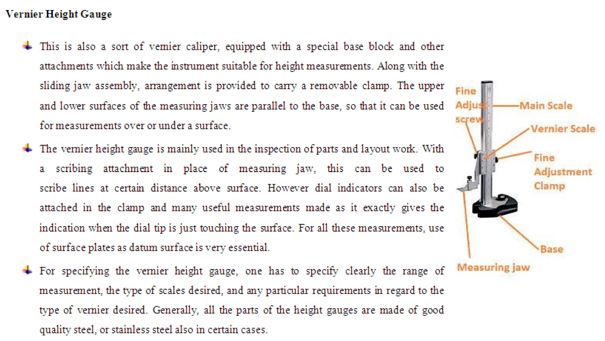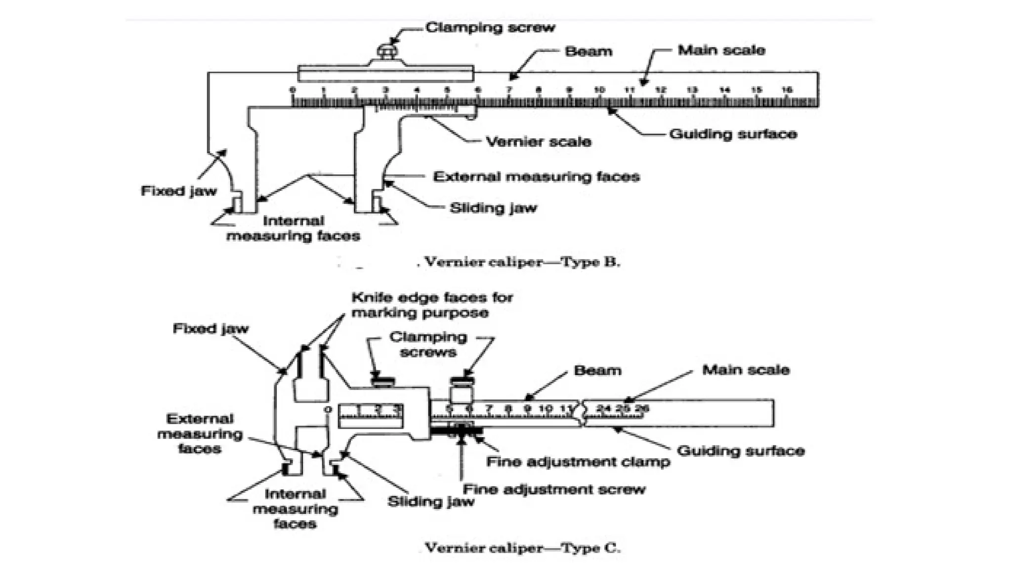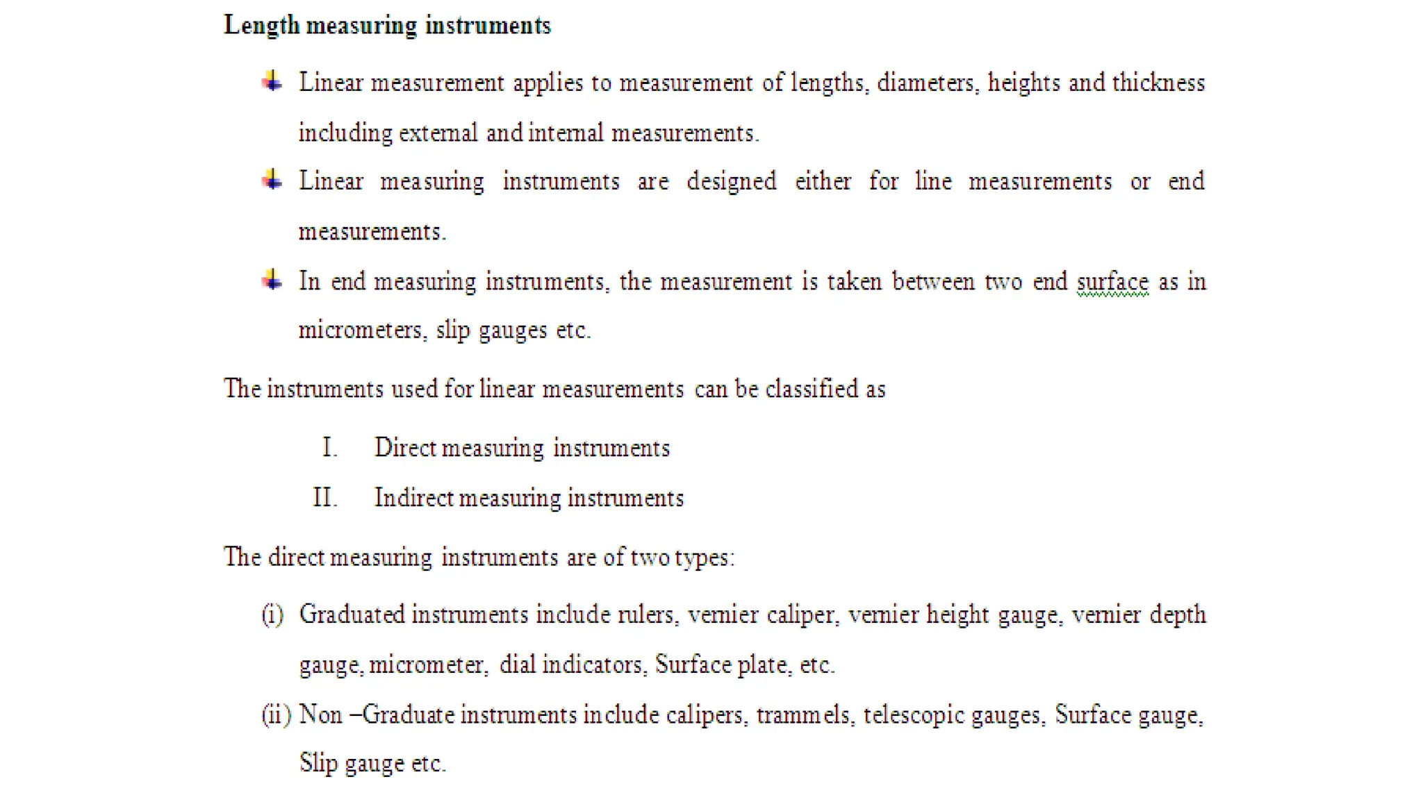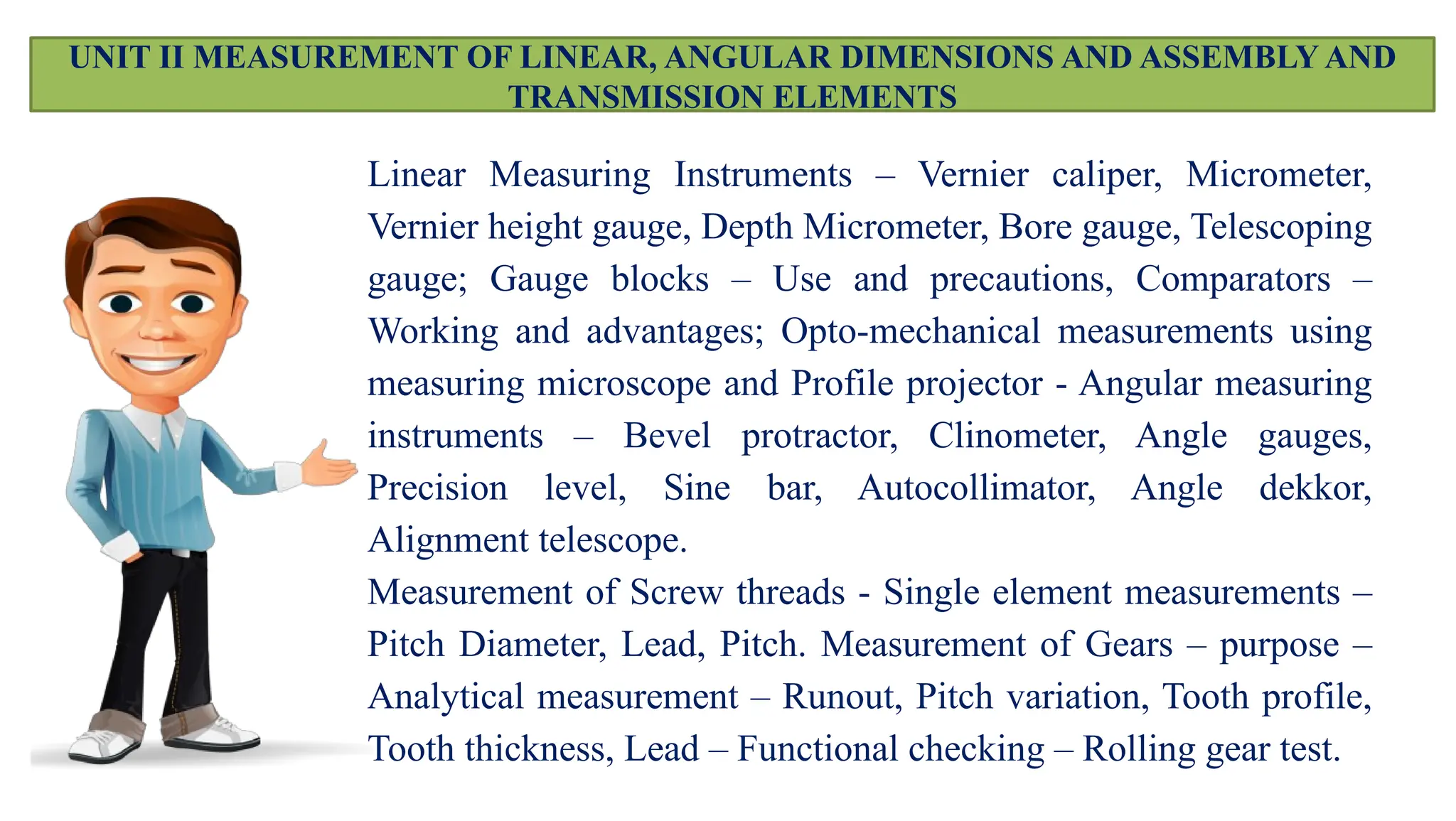 The document provides an overview of various linear and angular measuring instruments used in metrology, including vernier calipers, micrometers, and height gauges. It details their construction, types, applications, and guidelines for accurate measurement, emphasizing the importance of careful alignment and use of reference points. Additionally, it addresses the calibration and maintenance of these tools to ensure precise measurements in mechanical engineering and machining.