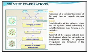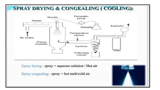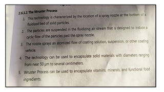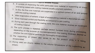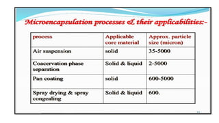 The document provides a comprehensive overview of microencapsulation, a process involving the coating of tiny solid or liquid particles with polymeric materials to ensure controlled release and protection of active ingredients. It discusses the history, definitions, various techniques (such as coacervation, spray drying, and air suspension), advantages, disadvantages, and applications of microencapsulation in pharmaceuticals and food industries. Key factors affecting encapsulation efficiency are also highlighted, including coating materials and methods used in the process.