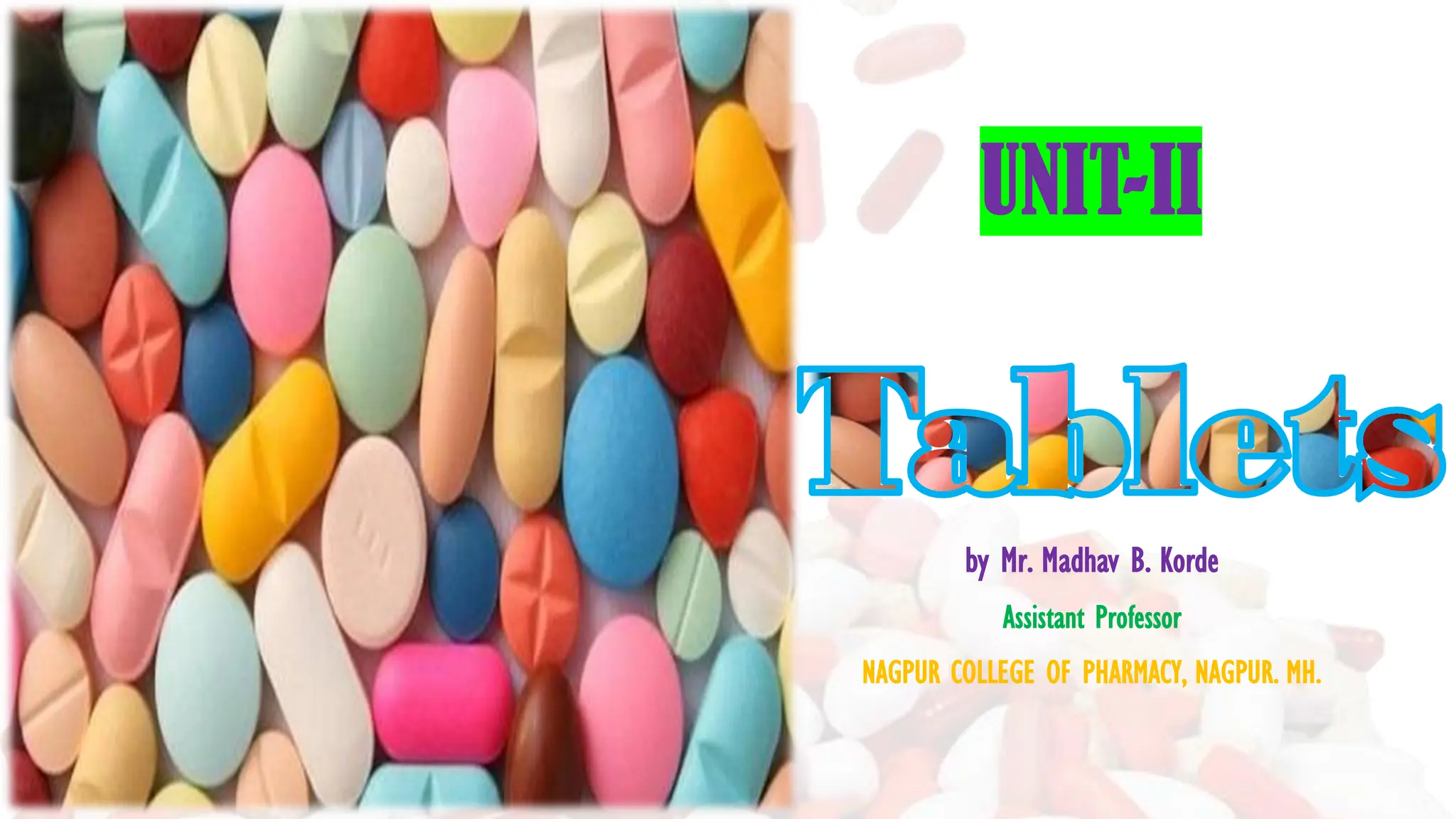 The document by Mr. Madhav B. Korde discusses various aspects of tablet formulation, including ideal characteristics, advantages and disadvantages, and classifications of tablets. It outlines the methods of preparation, excipients used, and specific types of tablets such as compressed, multilayered, and sustained-release, along with their applications. Key points emphasize the role of excipients and their properties essential for effective tablet production.