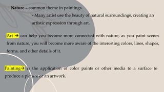 1. The document discusses color theory and techniques for painting nature scenes. It describes the three properties of color - hue, intensity, and value.