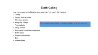 The document asks the reader to describe features of their local town or city such as traffic, pollution, homeless populations, recycling programs, greenery, stray animals, cleanliness, and conservation efforts. It prompts the reader to indicate if there are too many or not enough of each feature and to share their responses with the class.