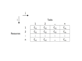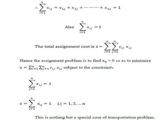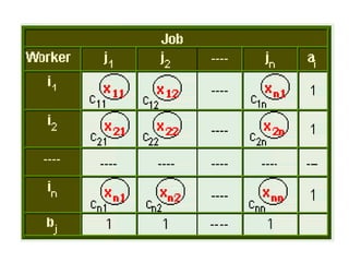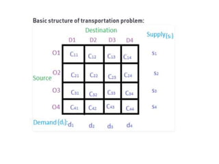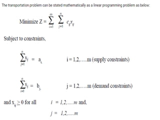 The document outlines the concept of transportation problems within linear programming, detailing methods to find initial basic feasible solutions such as the North West Corner Method, Least Cost Method, and Vogel's Approximation Method. It describes key definitions, including decision variables, feasible solutions, and conditions for balanced and unbalanced transportation problems while providing a mathematical model for minimizing transportation costs. Additionally, it includes practical examples and numerical problems to illustrate the formulation and solving of transportation models.