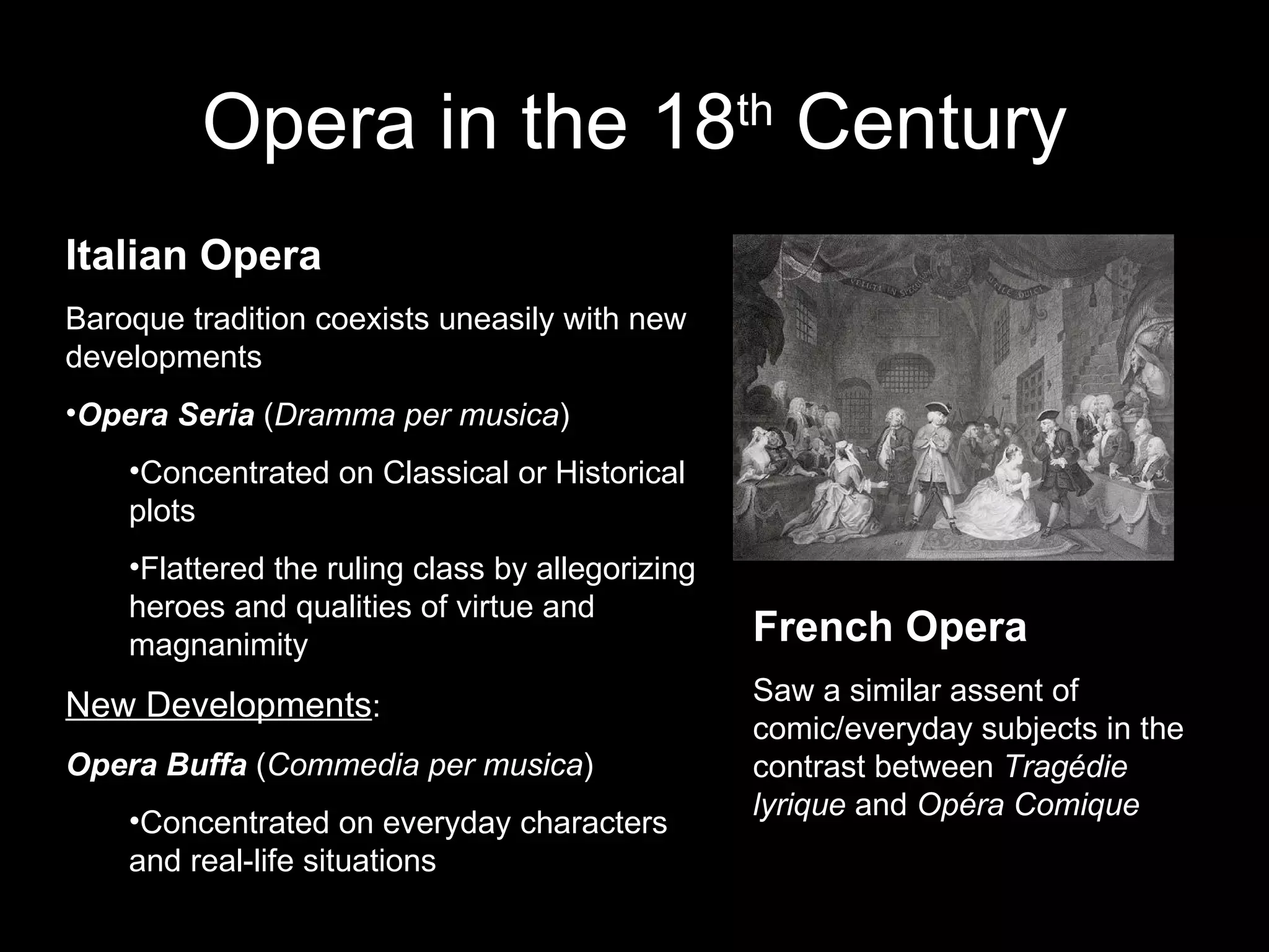 In the 18th century, Italian opera was dominated by the Baroque tradition of opera seria, which featured noble plots and virtuosic displays. New developments included opera buffa, focusing on everyday characters and comedy. Gluck's operatic reforms emphasized natural plots and music serving the drama. Mozart mastered both opera seria and buffa, composing serious works like Idomeneo and comic masterpieces like Le Nozze di Figaro and Don Giovanni, helping weaken distinctions between serious and comic opera.