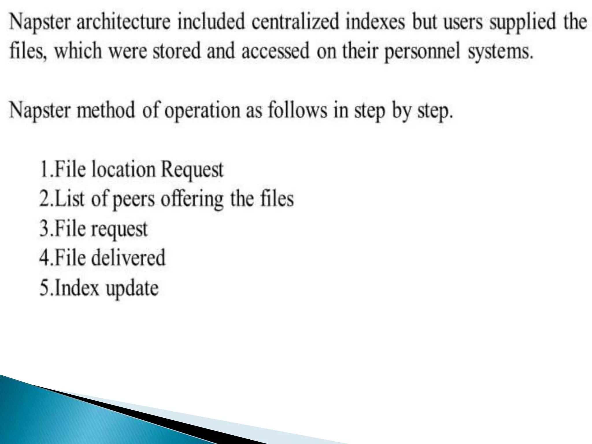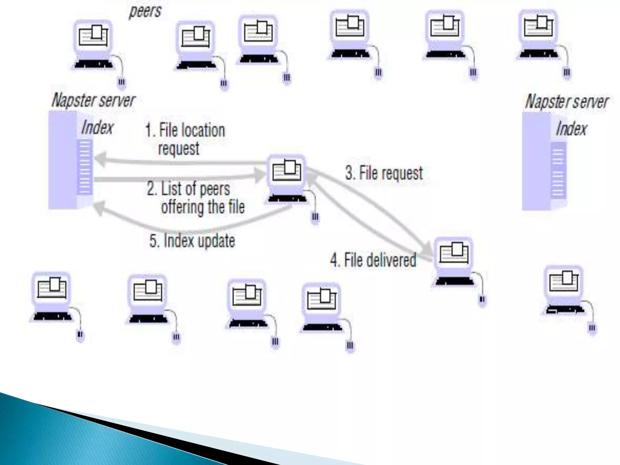 - How Napster worked, using central servers to index files shared across the decentralized network of users' computers while file transfers occurred directly between nodes.