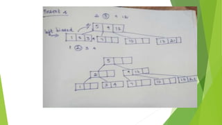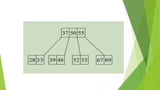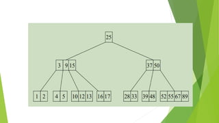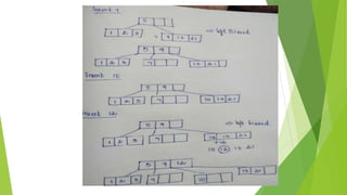 This document discusses binary search trees and AVL trees. It begins with an introduction to binary search trees and their properties. It then describes AVL trees, which are self-balancing binary search trees that ensure the height difference between any two subtrees of a node is at most 1. The document provides pseudocode for performing basic operations on AVL trees like insertion, single rotations, double rotations, and calculating the balancing factor. It also includes examples of calculating heights and balancing factors for AVL tree nodes.