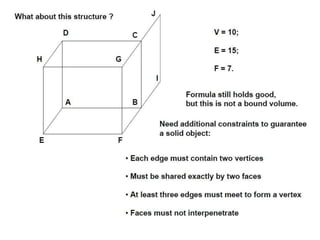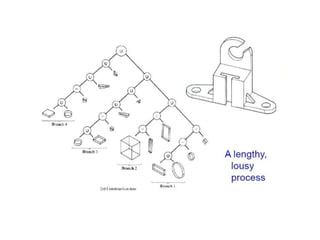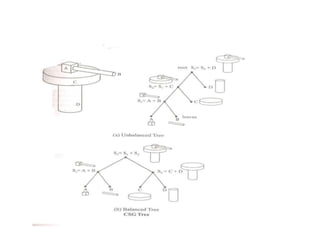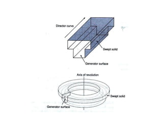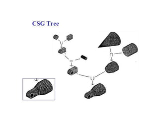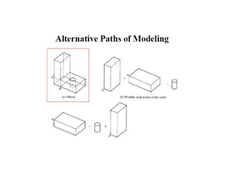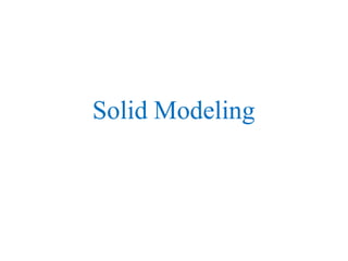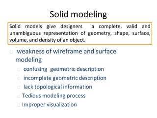 The document discusses solid modeling, emphasizing its advantages over wireframe and surface modeling by providing complete geometric and topological representations of objects. It highlights various methods of solid modeling, including boundary representation (b-rep) and constructive solid geometry (csg), along with their respective strengths and limitations. Solid modeling is integral to design and analysis, offering tools for visualization, property calculations, and effective manufacturing applications.