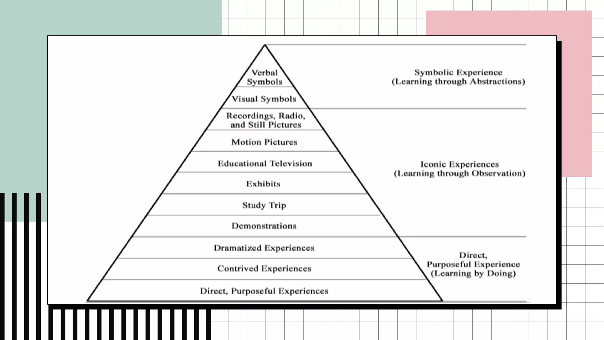 This document discusses Edgar Dale's Cone of Experience, which illustrates how different types of instructional methods can influence learning retention rates. It presents the Cone of Experience as having 11 bands of experiences ranging from concrete to abstract: (1) Direct experiences allow for 90% retention rates while (2) reading allows only 10%. The Cone also represents a progression from easy to difficult as it moves up levels of abstraction. Using a variety of instructional methods that incorporate different sensory modes can help develop higher-order thinking skills in students.