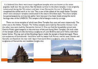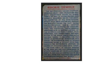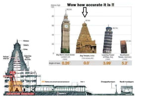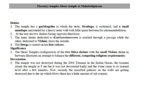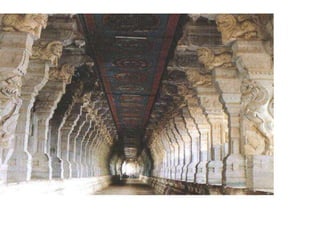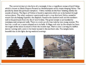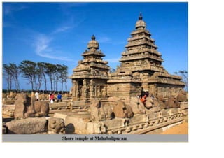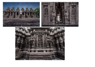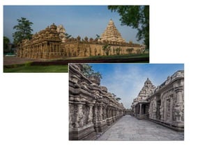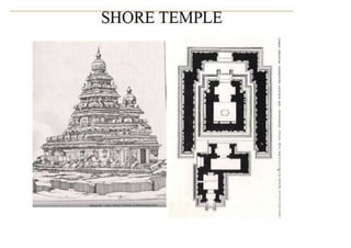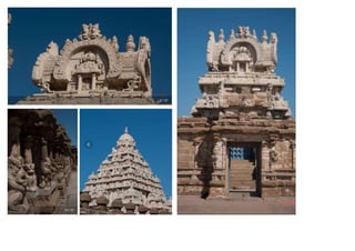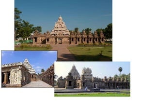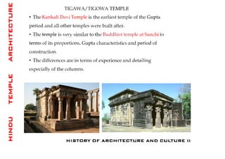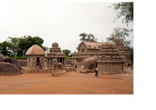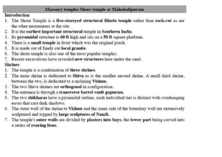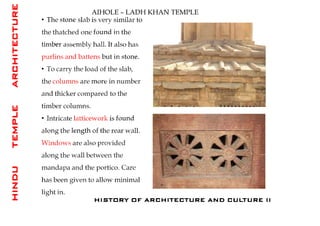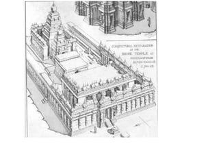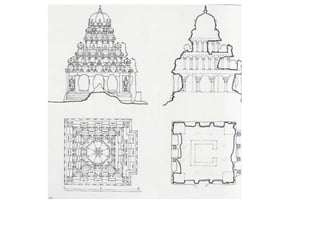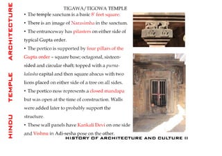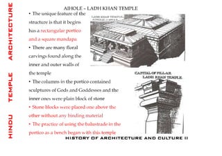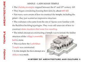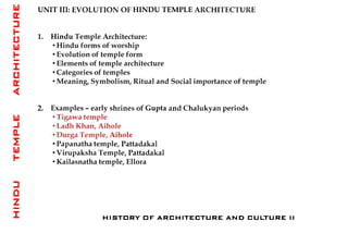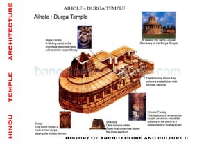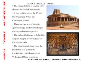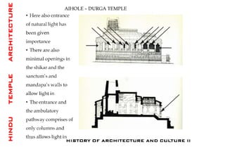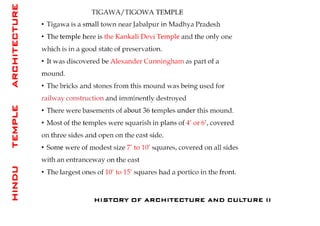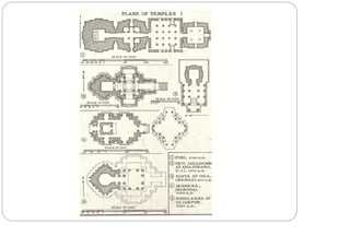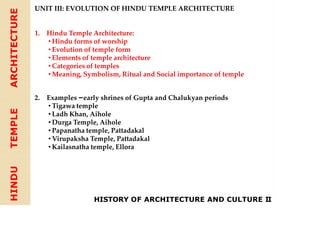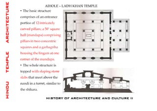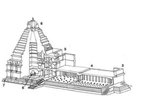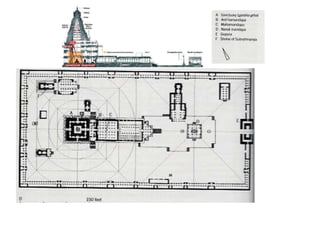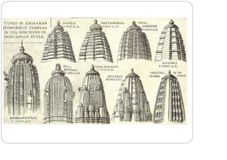 The document discusses the evolution of Hindu temple architecture in India from ancient to medieval periods. It begins with the Vedic period which had raised platforms for rituals and evolved to include stone structures like the garba-griha during the Shunga period. Major developments occurred in the Gupta and Chalukyan periods when temples became more permanent with elements like the shikhara, mandapa, and garba-griha. The two main styles that emerged were the Indo-Aryan and Dravidian styles, with early examples found in Aihole and Pattadakal. The document then focuses on features of Orissan temples from 800-1250 AD including the linga-raj, Sun Temple, and elements like