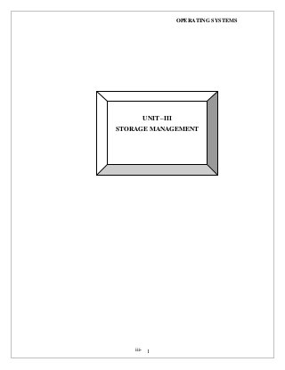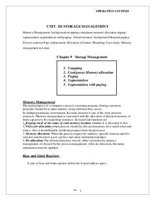 This document discusses different memory management techniques used in operating systems including swapping, contiguous allocation, and dynamic storage allocation. Contiguous allocation can be done using a single or multiple partitions. Dynamic storage allocation uses a first-fit, best-fit, or worst-fit algorithm to allocate memory from holes of available space to requesting processes. Fragmentation, including external and internal fragmentation, is also discussed. Memory management aims to efficiently allocate memory resources to processes while executing programs in memory and tracking the status of allocated and free memory locations.