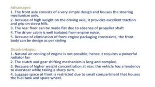 2. It also discusses the different types of chassis used in automobiles like the ladder chassis, tubular chassis, and monocoque chassis. The functions of the chassis include supporting the vehicle body and providing mounting locations for other parts.