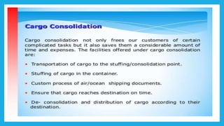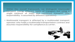 Multimodal transportation in India evolved from Indian Railways' efforts in the 1960s to containerize goods and move cargo in specialized containers. Standard ISO containers began being used in the 1970s. CONCOR was established in 1988 to take over existing ICD networks. The Multimodal Transport Act was passed in 1993 to establish liability regimes. Major manufacturing hubs contributing to exports are located in northern states like Punjab and Haryana, as well as Gujarat, Maharashtra, and Tamil Nadu. Sagarmala aims to enhance India's logistics performance through port modernization and connectivity improvements. Key components of multimodal transport include ICDs for cargo consolidation/deconsolidation and CFSs for handling less than container