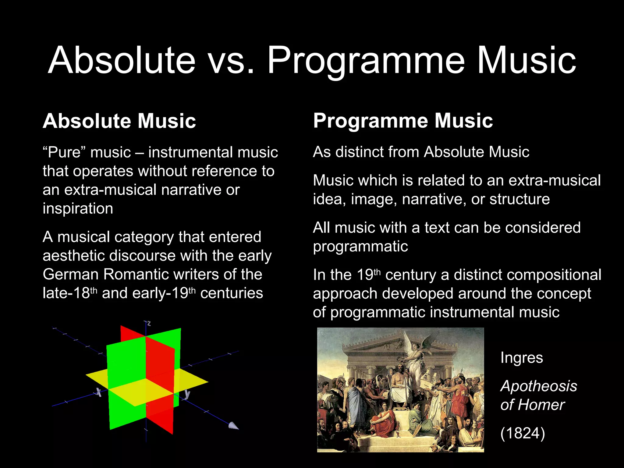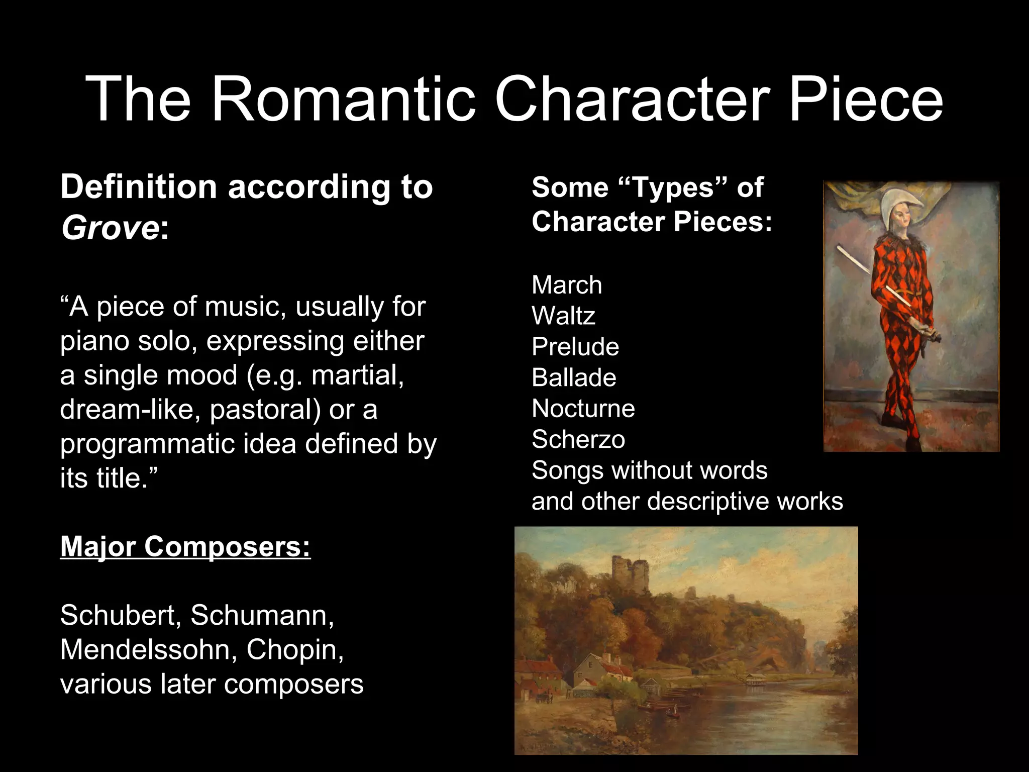 This document discusses different types of instrumental music, including absolute music and programmatic music. Absolute music is purely instrumental and not related to any extra-musical narrative, while programmatic music is inspired by or relates to ideas, images, or narratives outside of music. The Romantic character piece is described as a piano solo work that expresses a single mood or programmatic idea defined by its title. Major composers of character pieces mentioned include Schubert, Schumann, Mendelssohn, and Chopin. The document also provides biographical information about Chopin, Schumann, Liszt, Berlioz and their contributions to programmatic music forms like the symphonic poem.