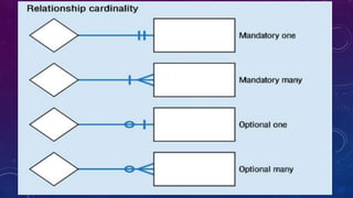 The document discusses entity relationship (ER) models and describes the key concepts including entities, attributes, relationships, keys, ER diagrams, weak entities, and mapping constraints. It provides examples of an ER model for a university database that includes the entities of students, courses, and professors. The model shows the relationships between these entities, their attributes, cardinalities, and a sample ER diagram. Overall, the document provides an overview of ER models and demonstrates how to design an ER schema for a database using a university example.