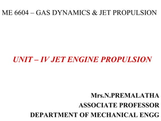 The document provides information about jet engine propulsion, including the major components and processes involved. It discusses the global momentum analysis and equations for jet engines. It also covers types of propulsion systems, classifications of jet engines, and the basic operation and components of jet engines such as the compressor, combustor, turbine, and nozzle. Key components and their functions are described, including how compressed air is mixed with fuel and ignited to produce thrust through exhaust exiting the nozzle.
