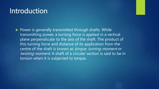 The document discusses the theory of torsion, focusing on how torque is applied to shafts and the resulting twisting effect known as torsion. It outlines the assumptions made in pure torsion theory and compares the advantages of hollow shafts over solid shafts, such as greater torsional strength, stiffness, and reduced material requirements. The document also briefly mentions a torsion testing machine used for experimental purposes.