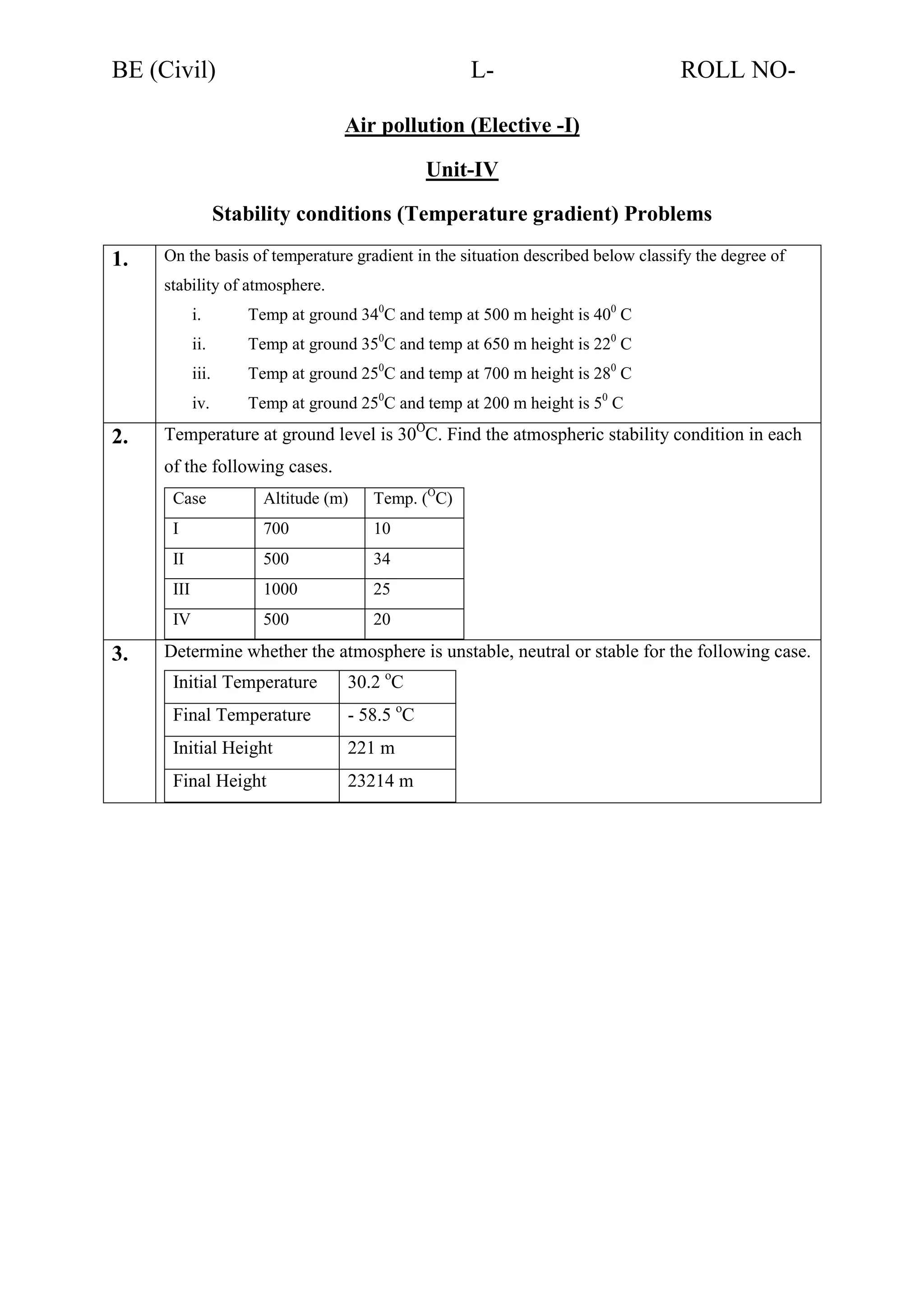 The document contains various problems related to air pollution meteorology, focusing on atmospheric stability conditions, wind speed estimations at different altitudes, maximum mixing depth calculations, minimum stack height determinations, plume rise estimations, and emission rate calculations from coal-fired power plants. Each section presents specific scenarios with data sets, requiring the application of relevant formulas and models for environmental impact assessments. This resource is intended for civil engineering students specializing in air pollution control.