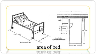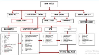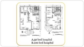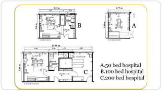 This document outlines the layout plan and design considerations for a hospital unit. It discusses the key divisions of a hospital including administration, outpatient care, diagnostic services, inpatient wards, and general services. For each division, it identifies the main components and provides guidance on location and typical space requirements based on hospital size. Zoning principles and types of circulation within the hospital are also covered. Design factors such as flexibility, accessibility, and future expansion are emphasized.