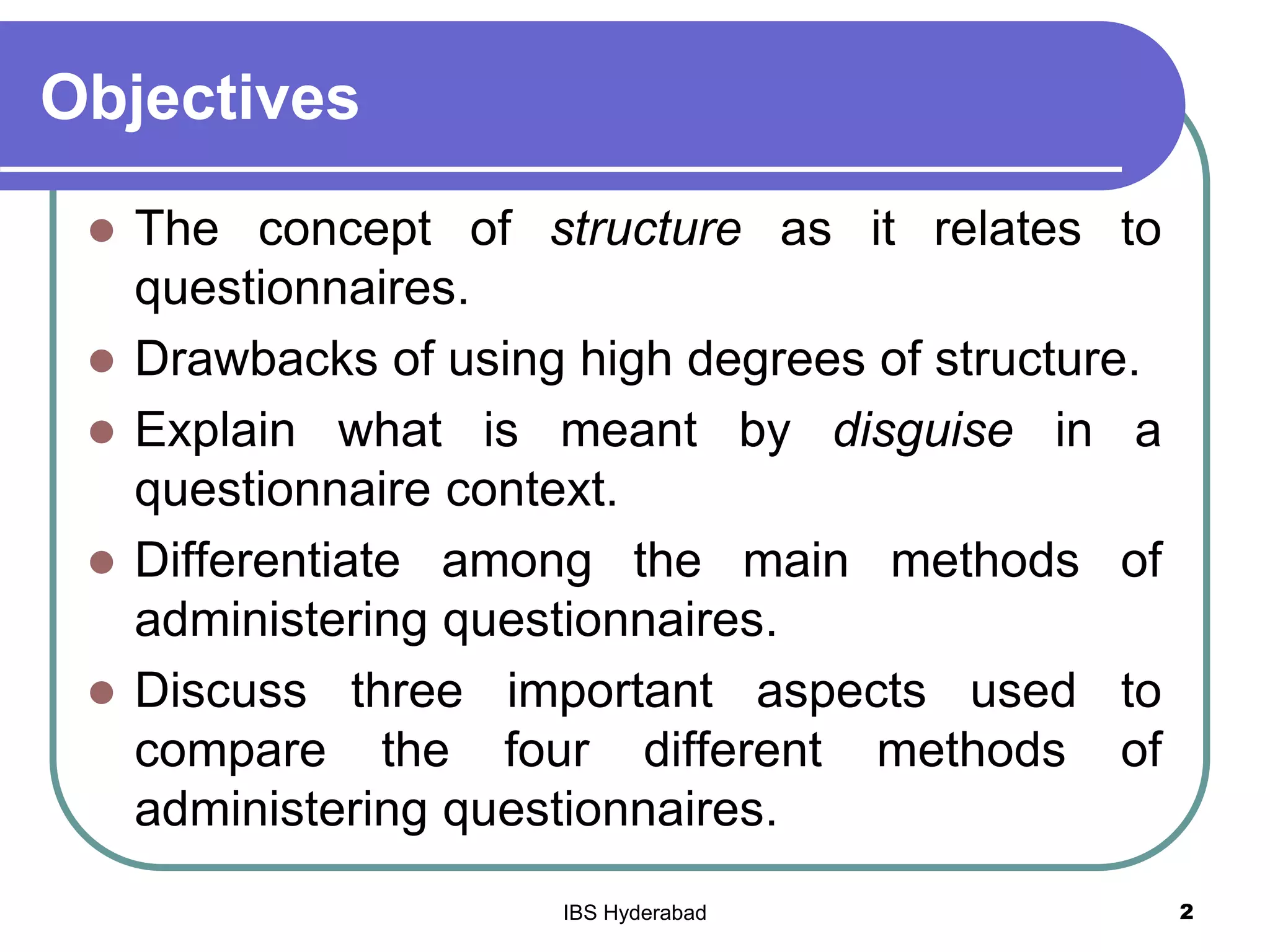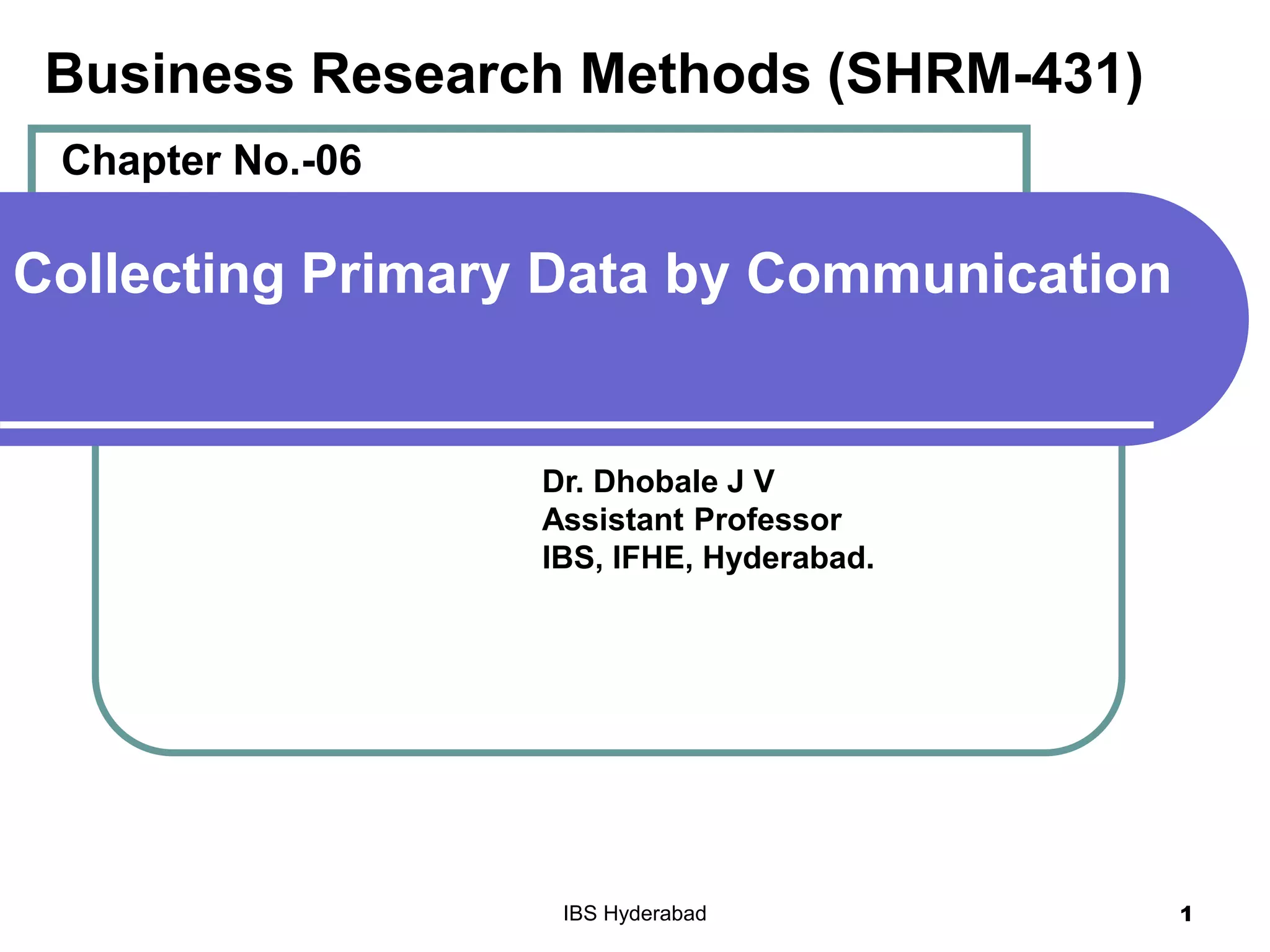 This document discusses methods for collecting primary data through communication. It covers structured versus unstructured questionnaires, disguised versus undisguised questionnaires, and four methods for administering questionnaires: personal interviews, telephone interviews, mail questionnaires, and internet-based questionnaires. For each method, it discusses three key aspects for comparison: sampling control, information control, and administrative control. The goal is to help researchers choose the most appropriate data collection method based on these considerations.