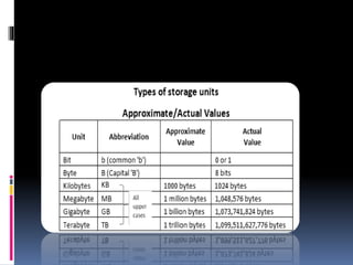 The document defines common units of storage in computers including bits, bytes, kilobytes and megabytes. It explains that a bit is the smallest unit and can have a value of 0 or 1, while a byte consists of 8 bits. A kilobyte is made up of 1024 bytes and a megabyte contains 1024 kilobytes. The document also provides conversion examples and lists learning objectives about understanding storage units and their values.
