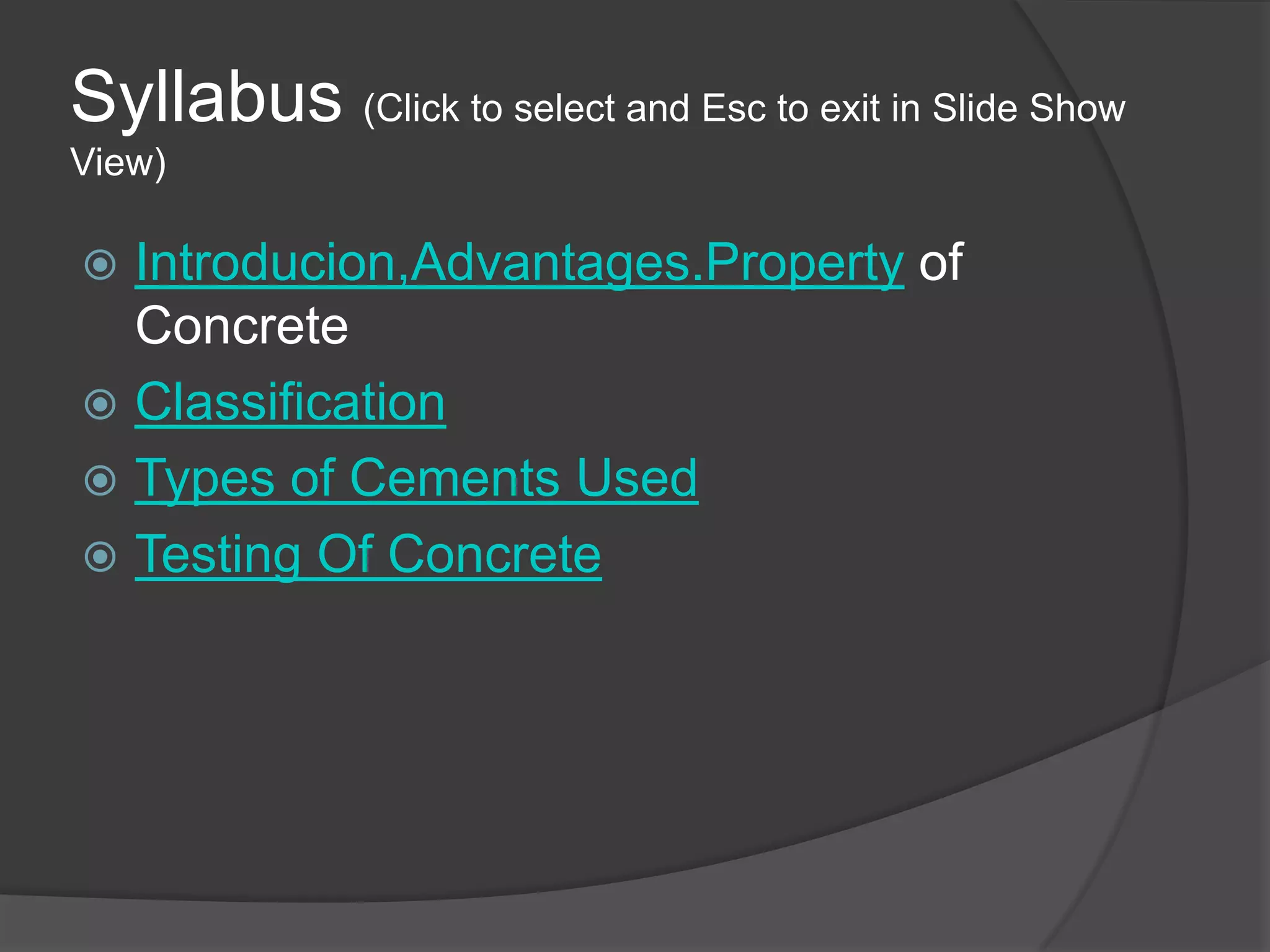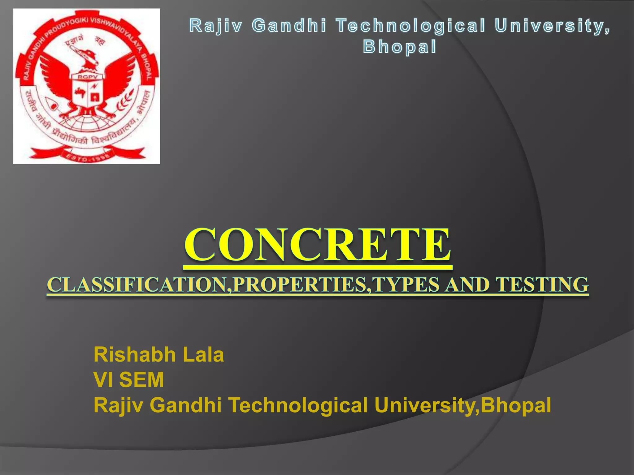 The document provides an overview of concrete, its properties, types, and the materials involved in its production. It discusses the advantages and disadvantages of concrete as a construction material, the qualities of good concrete, and details various types of concrete based on binding materials, design, and purpose. Additionally, it highlights important aspects such as water-cement ratios, workability, compaction methods, curing processes, and the different types of cement used in construction.