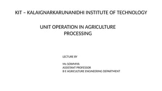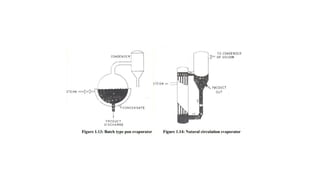 The document discusses the process of evaporation in agricultural food processing, emphasizing its role in concentrating liquid foods and enhancing microbiological stability. It outlines different types of evaporators used in the food industry, including batch-type, natural circulation, rising film, falling film, rising/falling film, and forced circulation evaporators. Key factors influencing the evaporation process, such as heat transfer and boiling point elevation, are also examined.