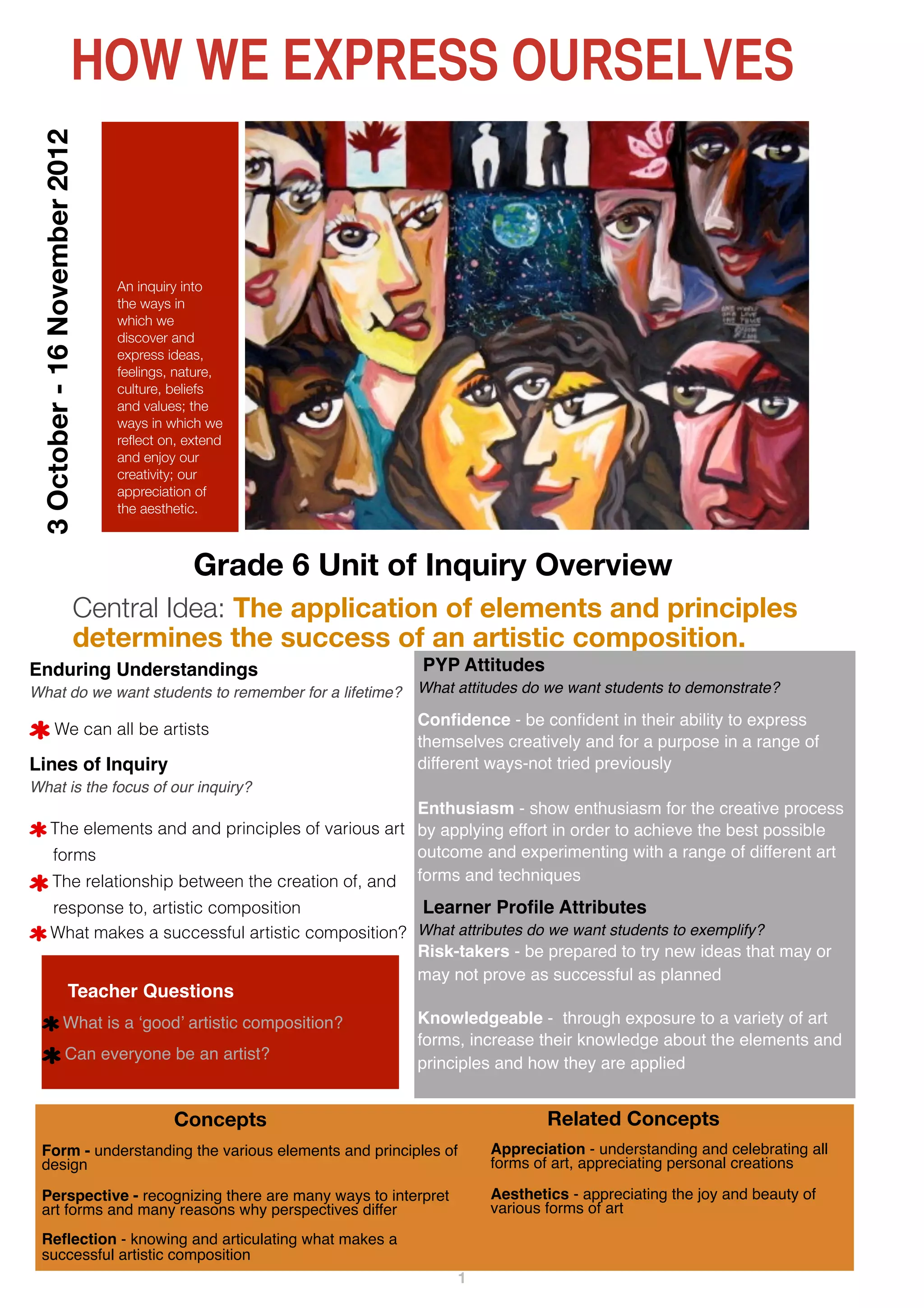 The unit of inquiry focuses on how the application of elements and principles determines the success of an artistic composition. Students will explore the elements and principles of various art forms and how they relate to creating and responding to artistic works. They will analyze what makes a successful composition through inquiry into line, shape, color, form, space, and other elements of design. The unit aims to develop students' confidence and risk-taking as they experiment with different artistic media and styles.