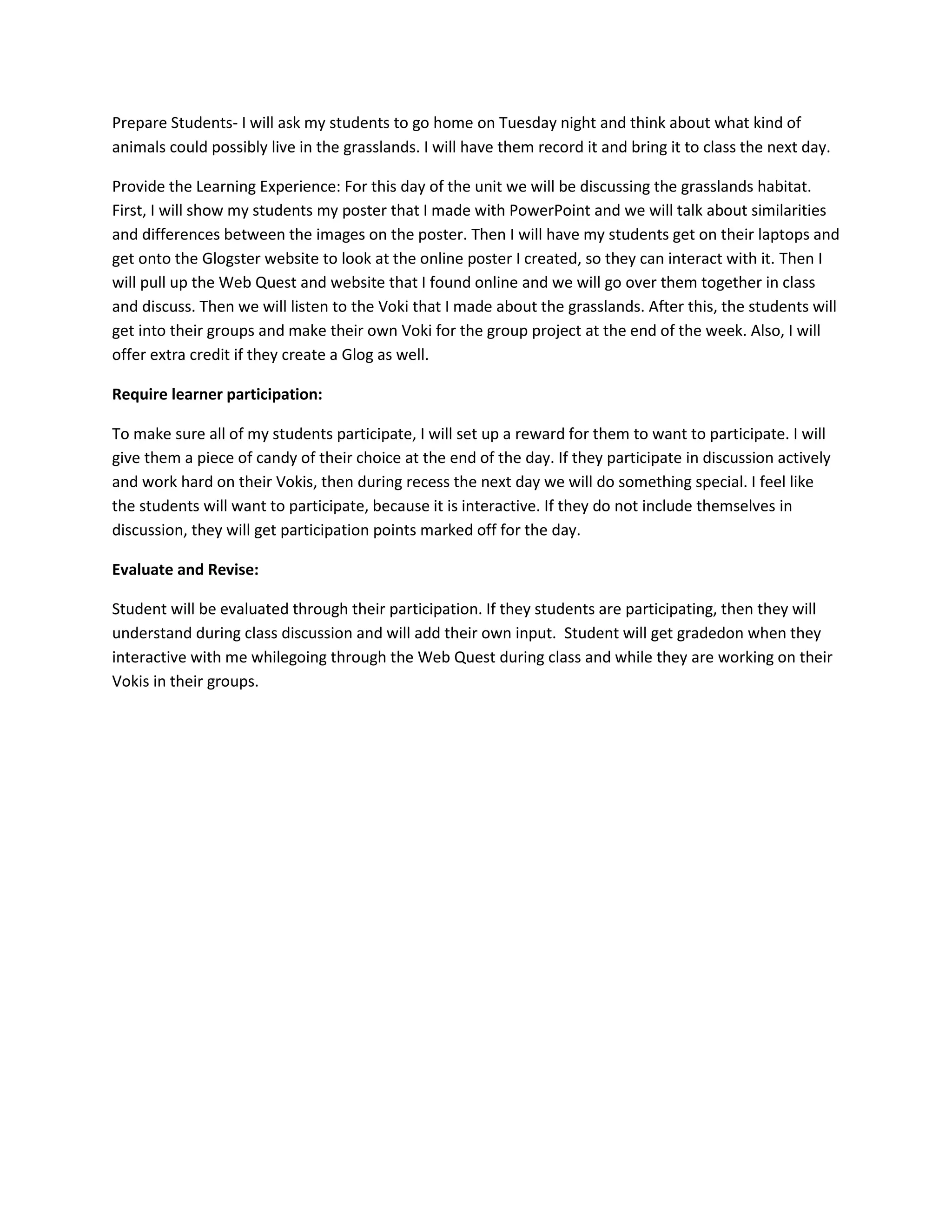The lesson plan is for a third grade class to learn about grasslands habitats. There are 25 students, most are boys. Two students have ADD. The objectives are for students to identify grasslands characteristics by exploring a poster, Glog, website, and Voki. Students will also create their own Voki in groups. To prepare, the teacher will charge laptops and load resources. During class, students will look at the poster and Glog, participate in a website discussion, and watch a Voki. Students will then make their own Voki in groups, with extra credit for a Glog. The teacher will reward participation through candy and recess to ensure engagement. Students will be evaluated on their discussion participation and work on