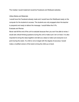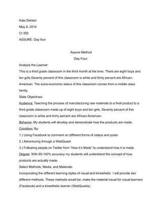 This document outlines an ASSURE lesson plan for a third grade class. The class has 18 students, with 70% white and 30% African American. The lesson will teach students about how raw materials are transformed into final products. Students will develop an understanding by interacting with videos and posts on Facebook, completing a WebQuest, and following people on Twitter from the "How It's Made" account. The goal is for 95-100% of students to understand the concept with accuracy. Visual and kinesthetic learning styles will be supported through Facebook for visual learners and a WebQuest for kinesthetic learners. Feedback will be gathered during the lesson to evaluate understanding and make revisions if needed to help any students having difficulty meet the