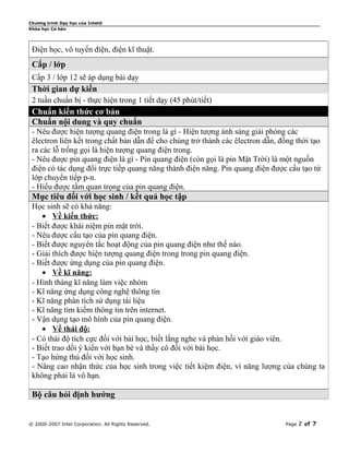 Bài dạy về năng lượng quang điện trong khuôn khổ chương trình giáo dục của Intel tập trung vào việc giới thiệu và ứng dụng pin mặt trời cho học sinh lớp 12. Học sinh sẽ tham gia vào dự án nhóm để tạo mô hình pin quang điện, tìm hiểu nguyên lý hoạt động, cấu tạo và ứng dụng thực tiễn của pin mặt trời, đồng thời phát triển các kỹ năng làm việc nhóm và ứng dụng công nghệ thông tin. Qua đó, học sinh được khuyến khích tìm hiểu về tầm quan trọng của tiết kiệm năng lượng và năng lượng tái tạo.
