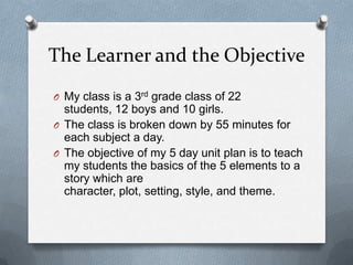 1. The unit plan aims to teach 3rd grade students about the 5 elements of a story - character, plot, setting, style, and theme - over 5 days.