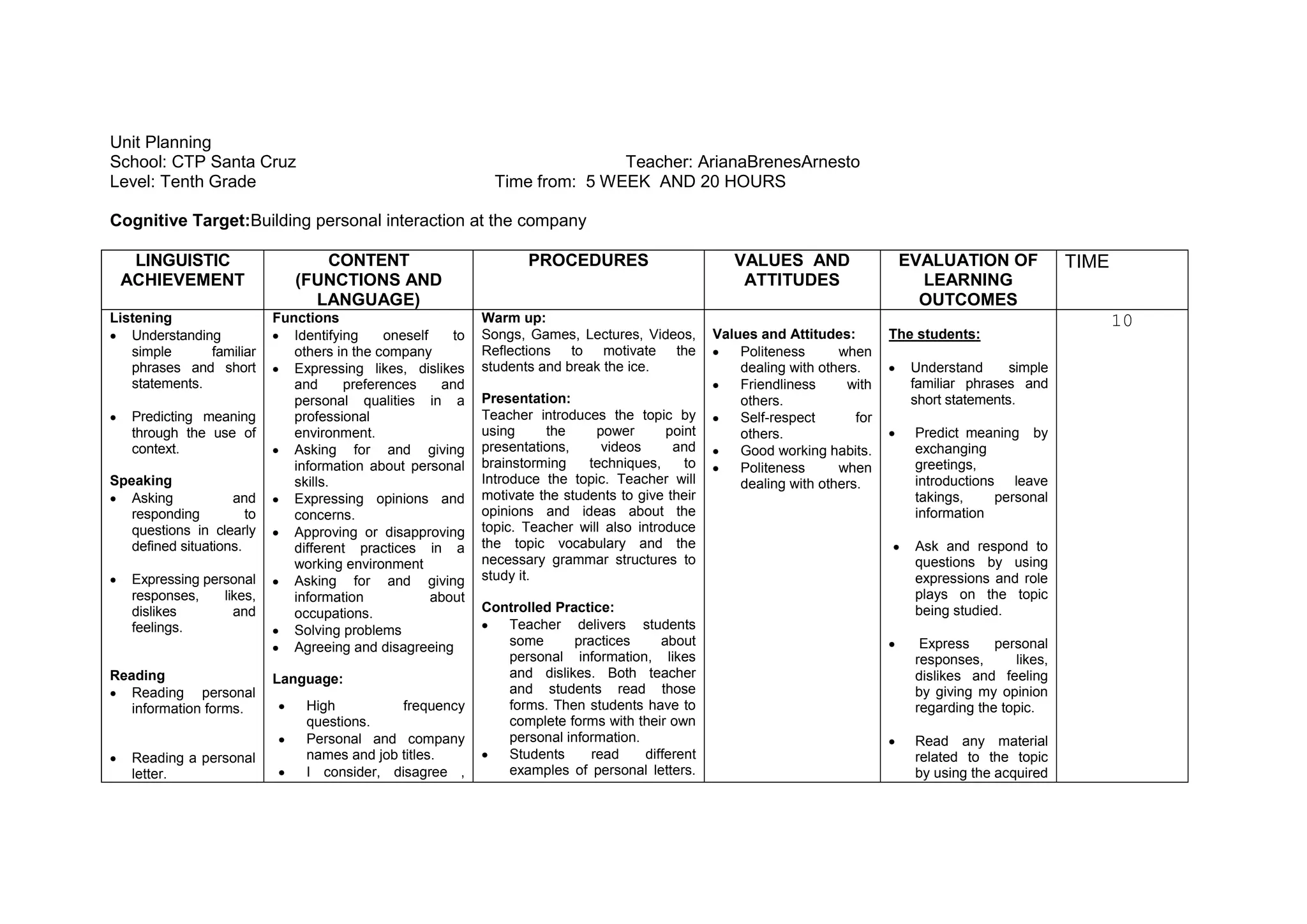 Unit Planning for a 10th grade class focusing on building personal interaction at a company. Over 5 weeks and 20 hours, students will work on listening, speaking, reading and writing skills through exercises on personal information, likes/dislikes, occupations, and expressing opinions. Evaluation will assess understanding of familiar phrases, asking/responding to questions, reading work-related texts, writing personal details and occupations, and valuing politeness and respect when interacting with others.