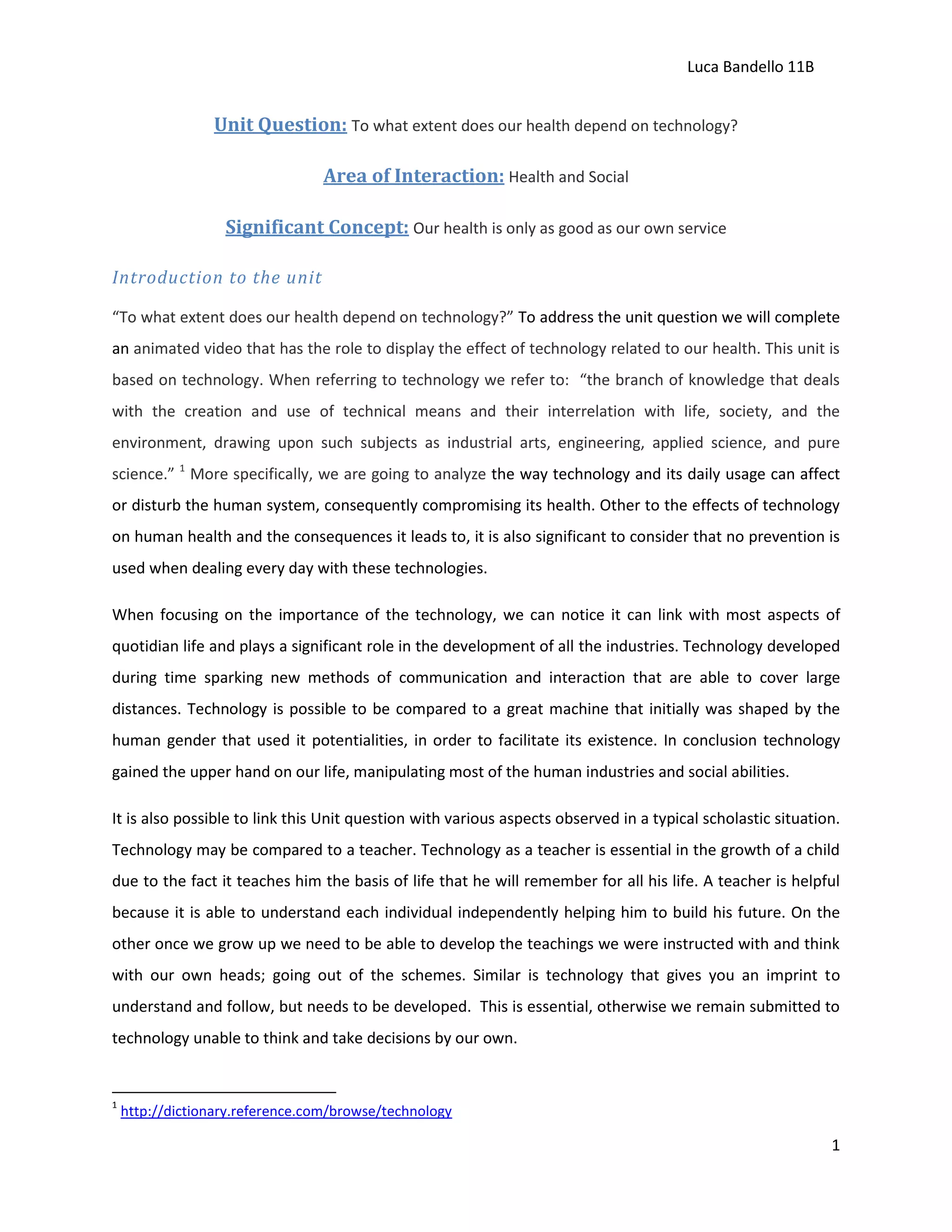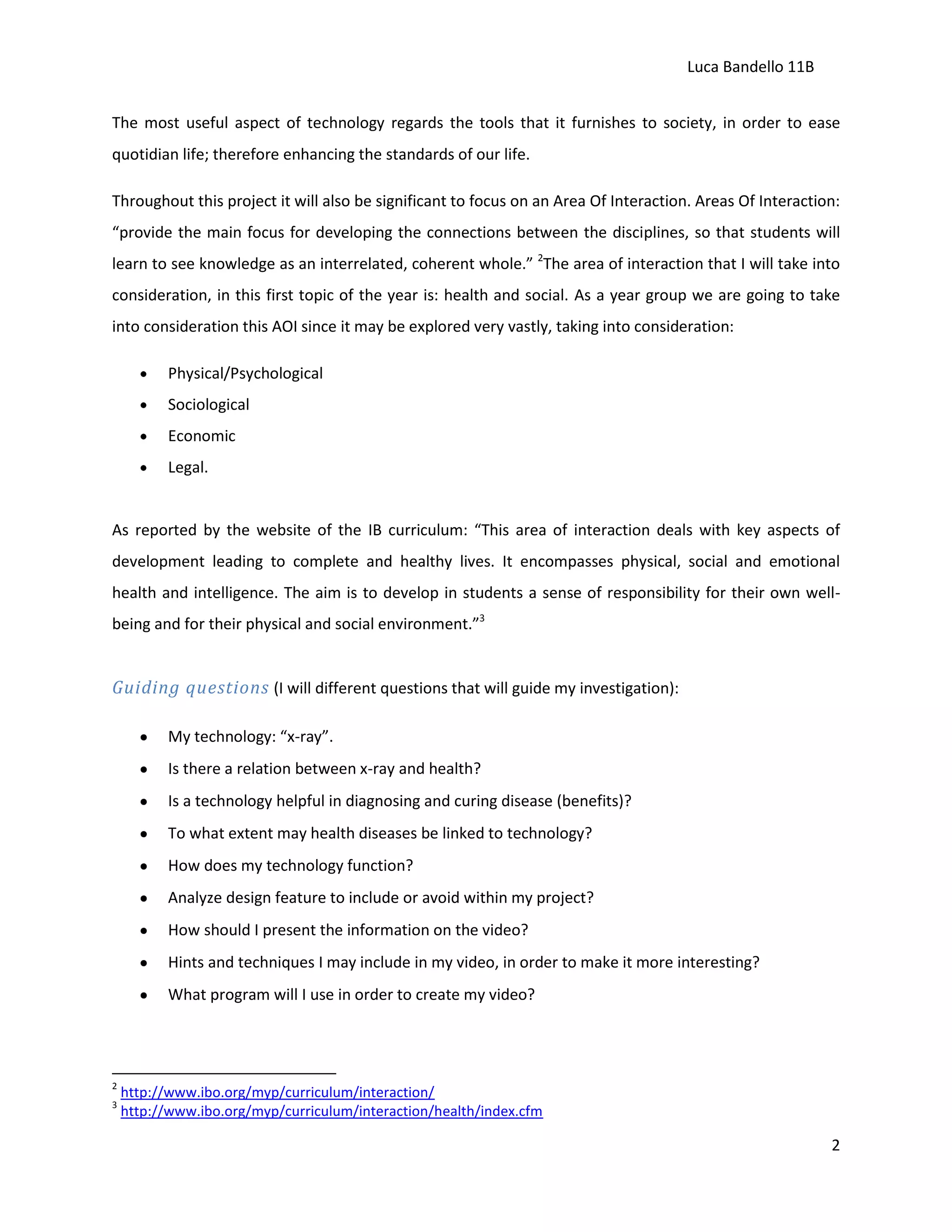 This document provides background information and guiding questions for a student project analyzing the relationship between health and technology, focusing on x-rays. It begins with an introduction outlining the unit question and focus on technology's effects on human health. Next, it provides context on the role of technology in society and comparisons of technology to a teacher. The document then lists guiding questions for the student's research and explains their choice to analyze x-rays. Finally, it shares information collected on how x-rays function, their relationship to health, their medical benefits, and design features to include or avoid in the student's video project.