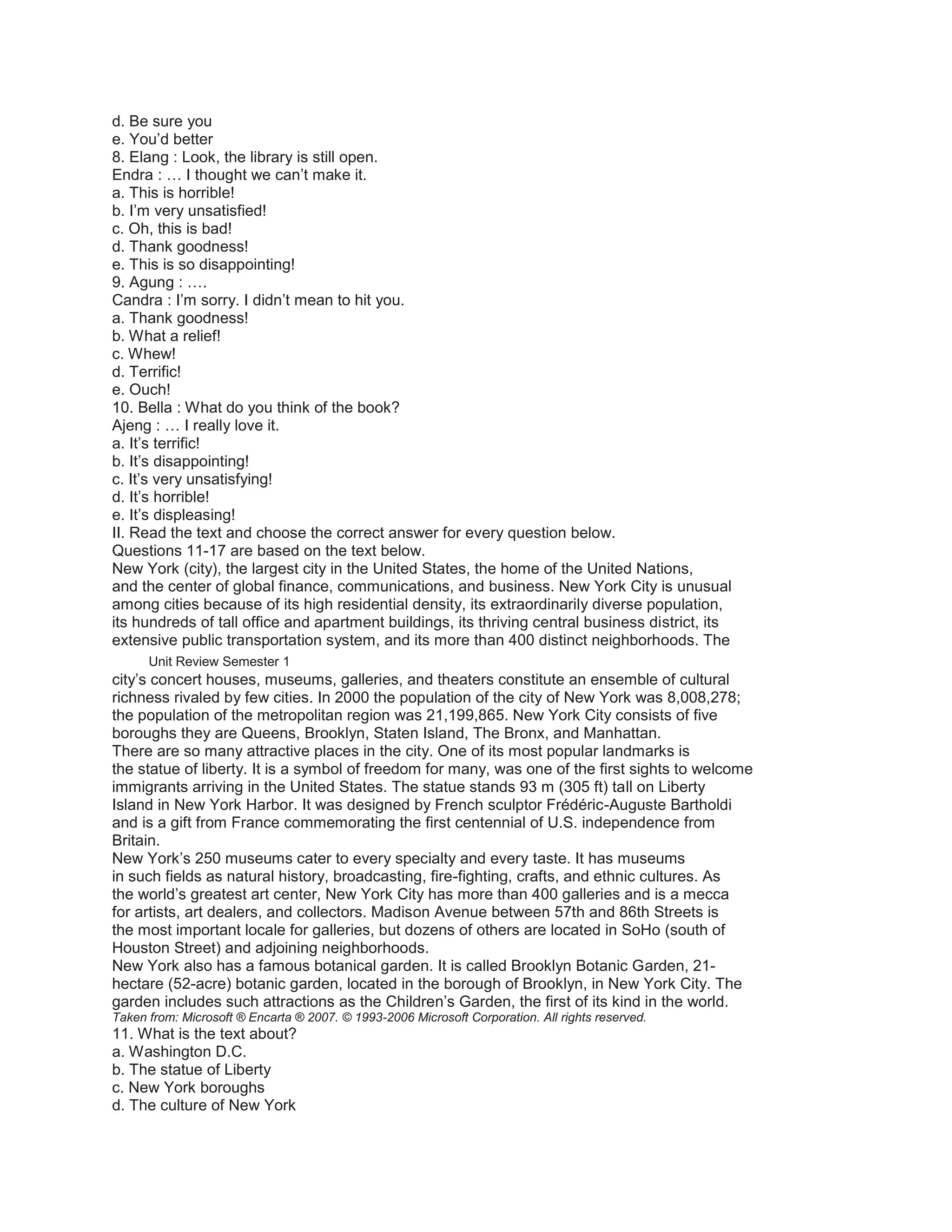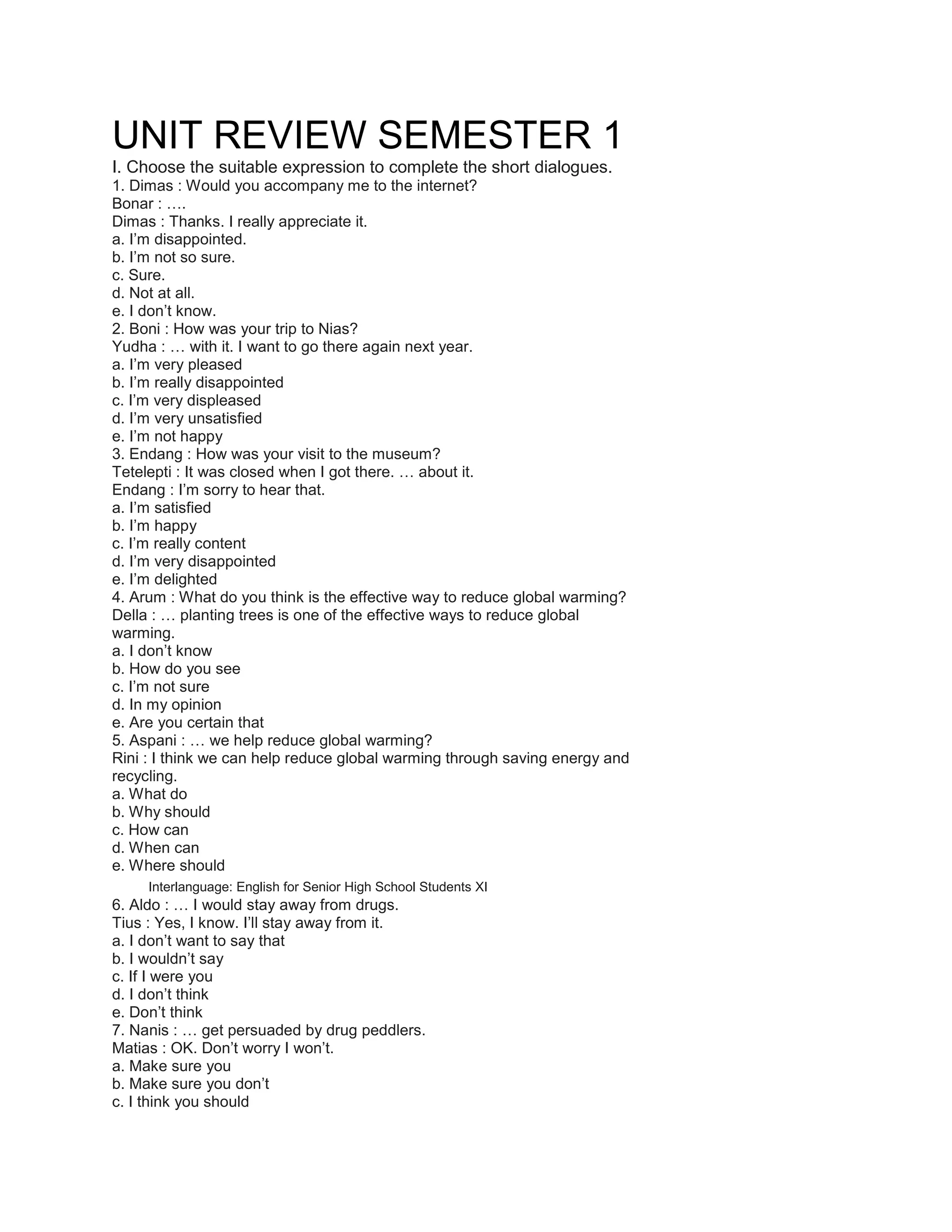 The document discusses a unit review with questions about completing dialogues and comprehending passages. It includes 10 short dialogues with missing responses to choose from and questions about two passages, one about New York City and one discussing whether Americans should be forced to use public transportation.