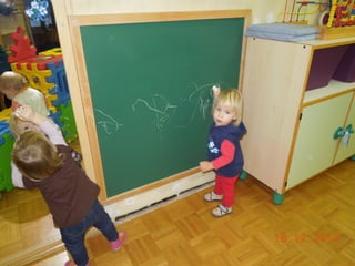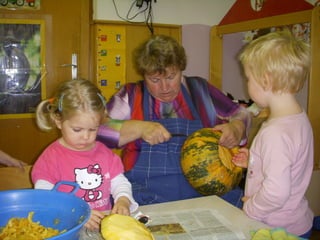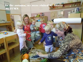 Auntie Autumn visited the children in the autumn and engaged them in various creative activities like face painting, playing with ice and snow, designing with clay, painting stones, and playing with Lego blocks. The older children visited a guesthouse and learned about the process of apples from picking them in the orchard to making apple juice. They baked treats like pastries and an apple and walnut roll. Parents introduced their professions like being a cosmetician. They also received visits from a dentist, nurse, and police officers who educated them about safety and traffic signs.