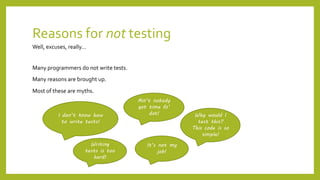The document explains the importance of writing unit tests in programming, dispelling common myths that deter developers from testing their code. It outlines ten key reasons for implementing unit tests, including reducing bugs in both new and existing features, improving code design, and providing documentation. Ultimately, it emphasizes that testing helps in maintaining code quality, enhances collaboration among developers, and promotes confidence in making changes.