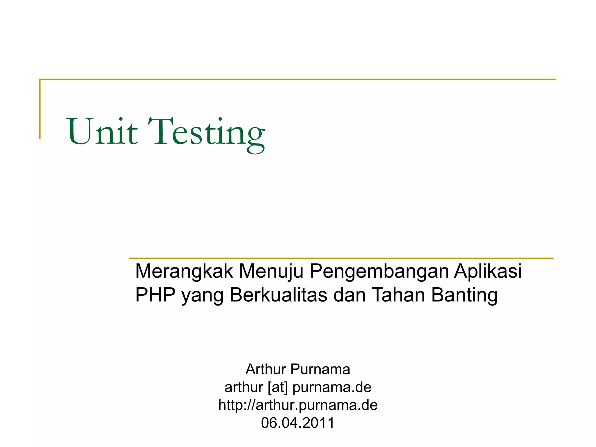 This document discusses the importance of unit testing in PHP application development and introduces the PHPUnit framework. It highlights the benefits of unit testing such as ensuring code functionality and facilitating better code integration, while providing examples of unit tests for a multiplication function. Additionally, it covers concepts like refactoring, dependency injection, mocks, and stubs, along with examples of organizing and writing effective unit tests.