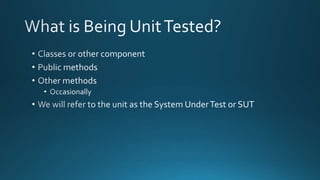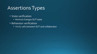 The document outlines a code testing structure using methods that include setting dependencies, exercising the system under test (SUT), and verifying expected behaviors. It includes specific tests for a method that creates a comma-separated string from two numbers. Additionally, it presents a class sample that interacts with a database dependency.