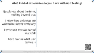 The document provides an introduction to unit testing from a tester's perspective, discussing key concepts like types of unit tests, their benefits, and real-world adoption practices. It emphasizes the importance of effective unit tests that are easy to maintain and integrated into the development cycle. Additionally, it encourages testers to participate in unit testing, suggesting ways to engage with developers and improve product code quality.