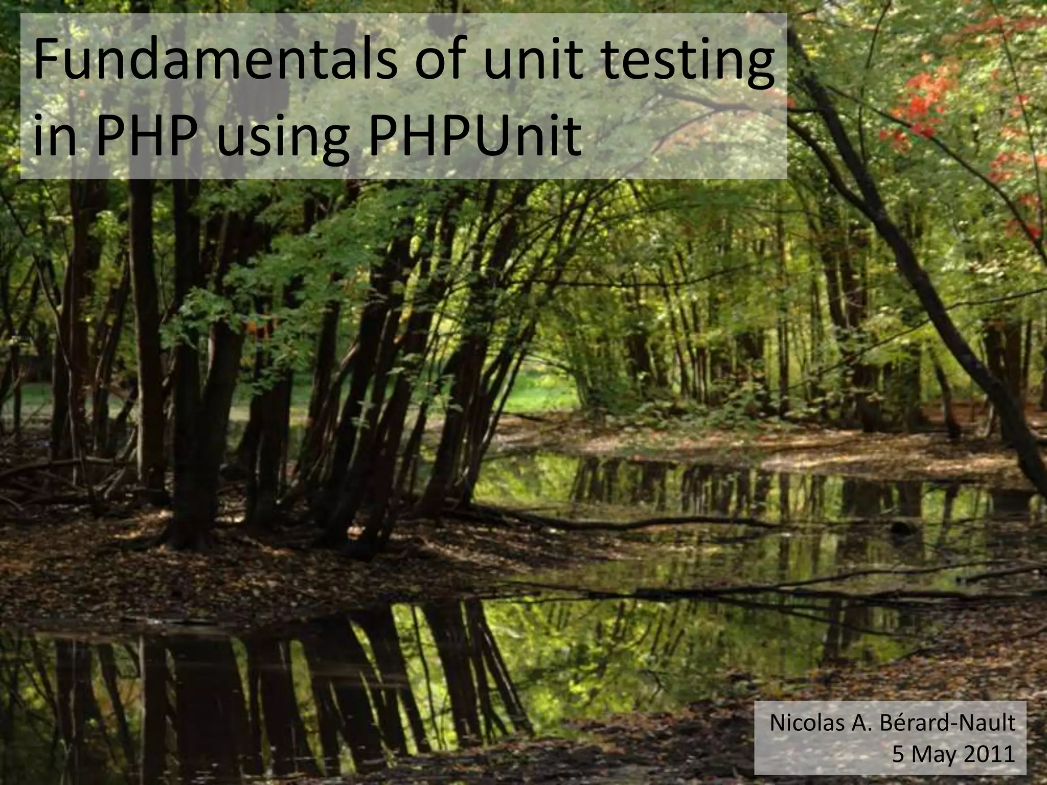 This document provides an overview of unit testing in PHP using PHPUnit. It discusses some goals of test automation like improving quality and reducing risks. It also covers the testing continuum from unit to integration to functional tests. The document introduces PHPUnit and how it is based on the xUnit family of tools. It then walks through an example of writing the first PHPUnit test to test a ROT13 encoding function in a test-driven way, demonstrating best practices like following the RED-GREEN-REFACTOR process and using assertions. Finally, it discusses principles of good test automation like independence of tests and isolating the system under test.
