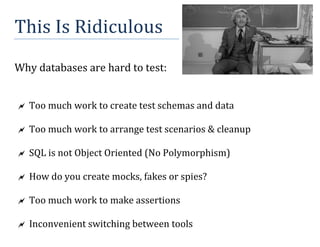 The document discusses challenges with testing SQL code and introduces tSQLt, an open source framework for unit testing Transact-SQL code. tSQLt allows writing unit tests in T-SQL, runs tests in isolated transactions, and provides tools to isolate dependencies like faking tables and spying on stored procedures. The document demonstrates how to install tSQLt and use it to test functions and stored procedures. It also outlines some limitations of tSQLt and provides further reading on the topic.