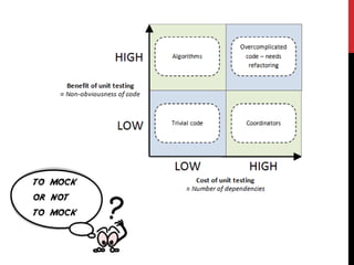 The document discusses different types of software tests including unit tests, integration tests, acceptance tests, load tests, and performance tests. It emphasizes the importance of unit tests for validating individual code modules and classes work as intended. Writing unit tests before coding allows developers to test complex scenarios quickly, ensure code quality and readability, and refactor code with confidence.