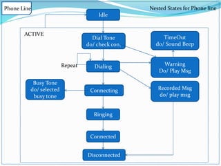 This document discusses nested state diagrams and interaction modeling techniques. It addresses: